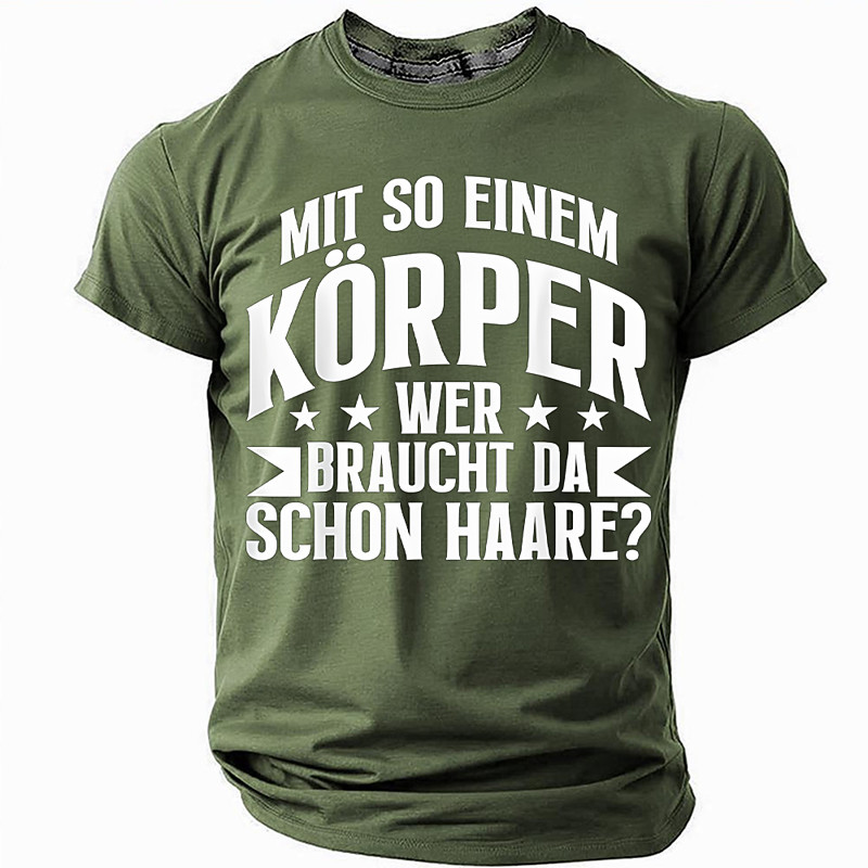 Men's Funny German Slogan T-Shirt: 'With A Body Like That, Who Needs Hair?' Short Sleeve Graphic Tee