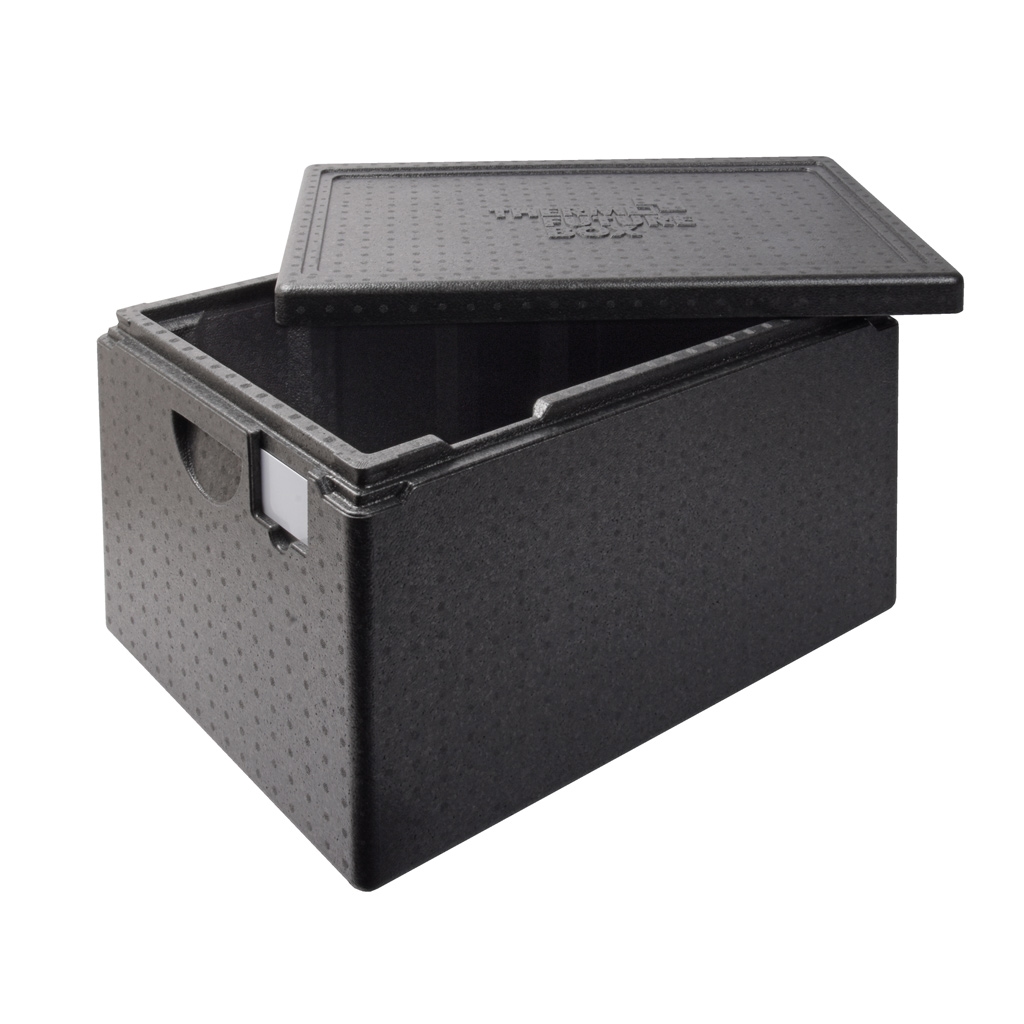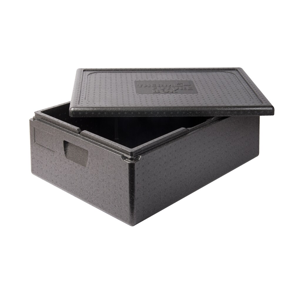 Thermo Future Box, passend für PIZZA und GN 2/3, Isolierbox schwarz mit Deckel, 210 mm tief, 27 Liter, robust, nachhaltig aus EPP