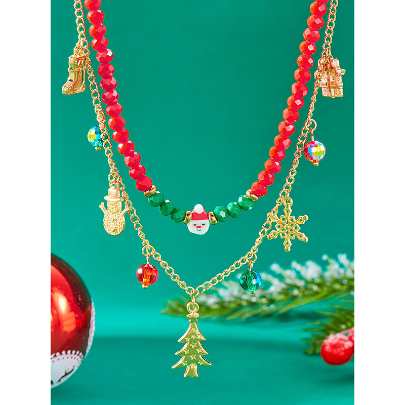 Women's Christmas Beaded Necklace Set – Red Green Beads with Santa, Snowman, and Tree Charms, Perfect for Holiday Parties and Festive Celebrations