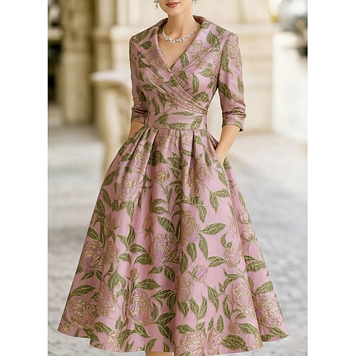 Linea ad A Lunghezza Tè Vestito da Festa Abito da Cocktail Abito da invitata a nozze Abito da Sera Elegante Vintage Manica 3/4 Colletto a Camicia Matrimonio Formale Jacquard con Tasca