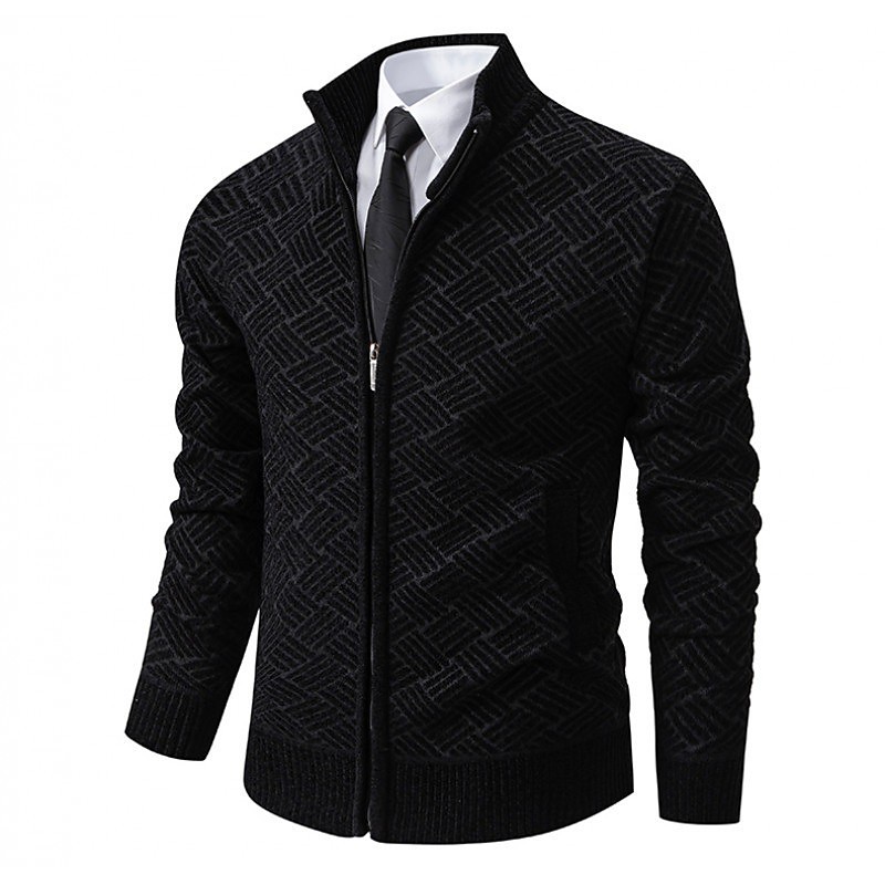 Men's Cardigan Zip Sweater Chunky Knit Regular Zipper Pocket Geometric Standing Collar Knitwear Elegant Home Work Clothing Apparel Bishop Sleeve Spring Fall Black Navy Blue M L XL