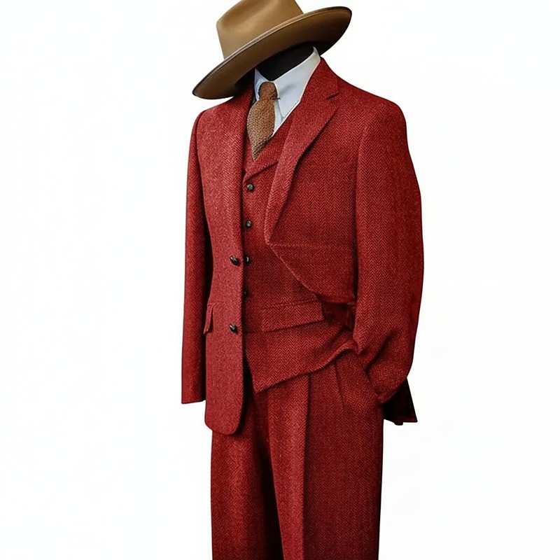 Herrenanzug aus Tweed mit Fischgrätenmuster, 3-teilig, Vintage, Retro, Übergröße, einfarbig, maßgeschneidert, einreihig, zwei Knöpfe, Braun, Burgunderrot, Dunkelmarineblau, Grün, Herbst/Winter