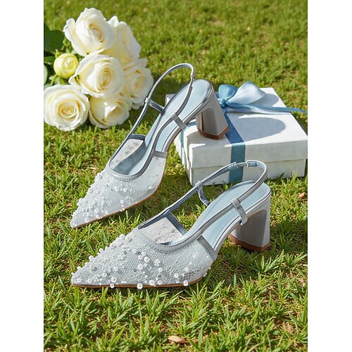 scarpe con tacco a spillo decorate con perle da donna - eleganti scarpe da sposa con punta a punta in pizzo per damigelle ospiti, tacchi a blocco per il giardino cerimonie all'aperto