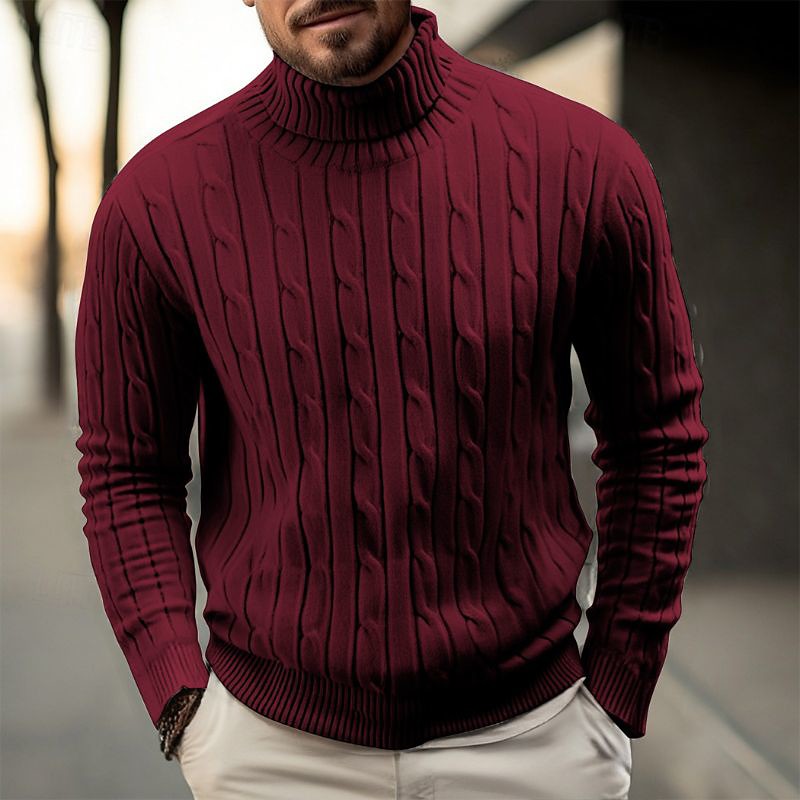 Men's Pullover Sweater Jumper Knit Sweater Ribbed Cable Knit Regular Tops Knitted Plain Turtleneck Fashion Casual Vacation Daily Wear Clothing Apparel Fall Winter Wine Green M L XL