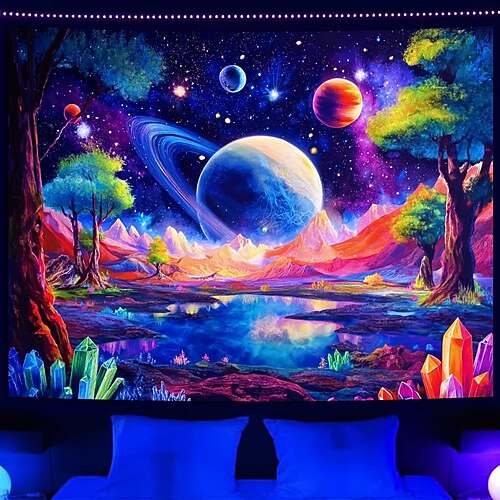 arazzo di luce nera galassia vibrante e luminosa Paesaggio di pianeti con montagne, laghi e cristalli, arazzo da parete per l'arredamento della camera da letto