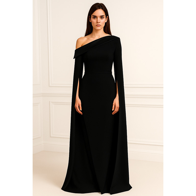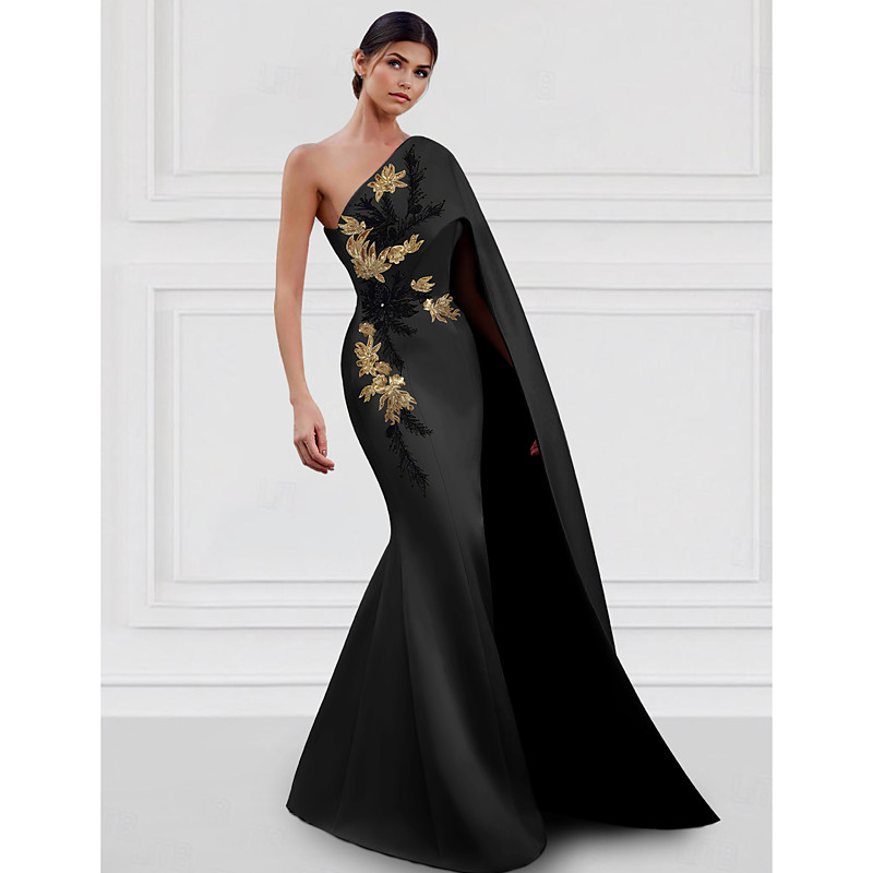 Mermaid Trumpet Floor Length Ball Gown with Cape Evening Gown Formal Dress Elegant Vintage Black Dress Long Sleeve One Shoulder Formal Capes Satin with Embroidery Appliques