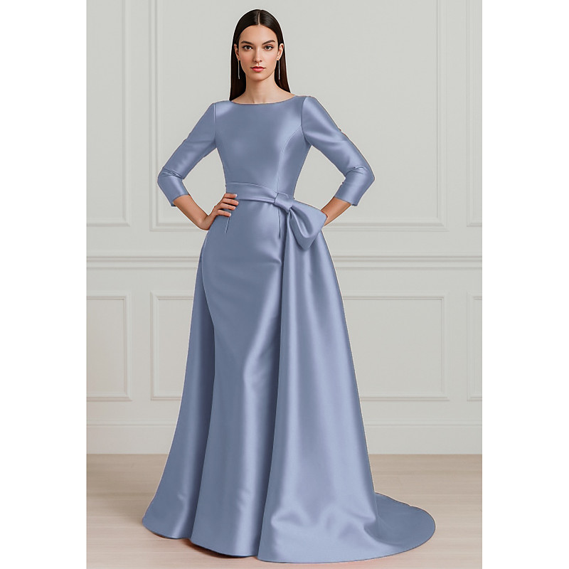 A-Line Floor Length Evening Gown Ball Gown with Overskirt Formal Dress Elegant 3/4 Length Sleeve Crew Neck Wedding Formal Stretch Satin with Pleats