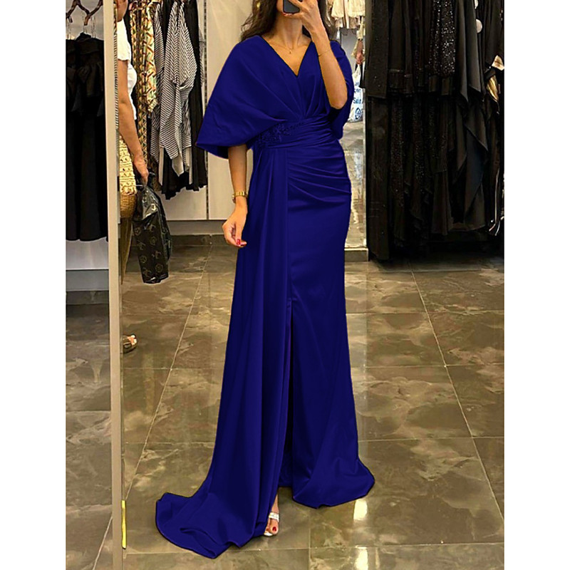 Sheath Column Sweep Brush Train Evening Gown Ball Gown with Overskirt Formal Dress Elegant Half Sleeve V Neck Formal Satin with Pleats Ruched Crystals