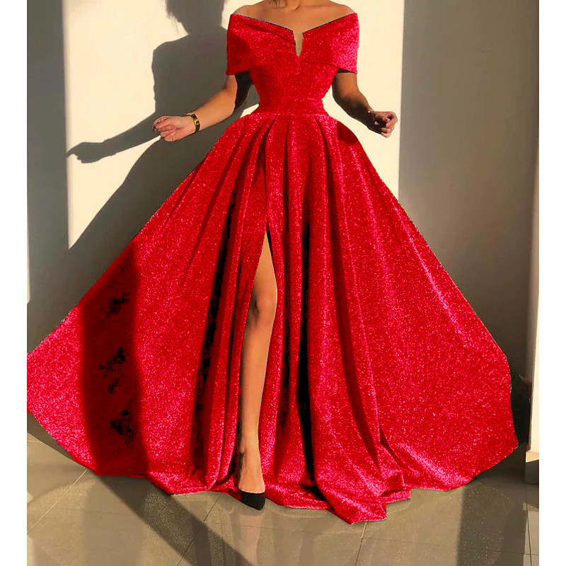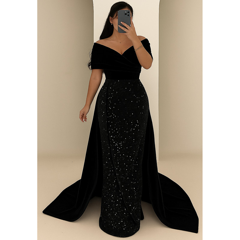 A-Line Sheath Column Floor Length Evening Gown Ball Gown with Overskirt Formal Dress Elegant Glittering Black Dress Short Sleeve Off Shoulder Wedding Formal Satin Velvet with Glitter