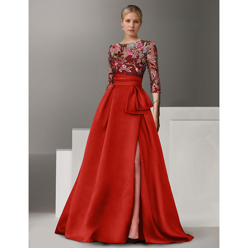 A-Line Floor Length Beaded Eembroidered Formal Dresses Mother of the Bride Dress Evening Gown Ball Gown Formal Dress Elegant Color Block High Split Half Sleeve Shirt Collar Wedding Formal Satin with