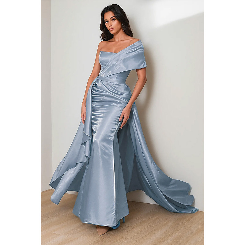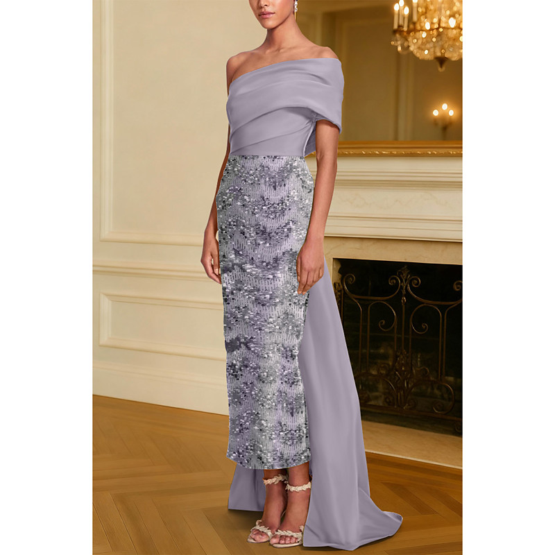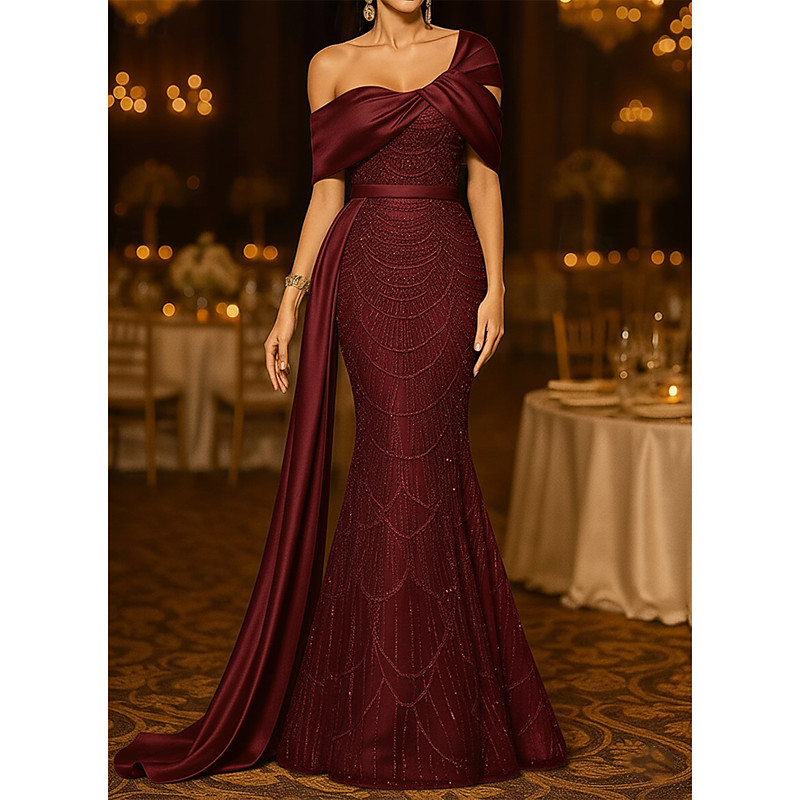 Sheath Column Floor Length Evening Gown Ball Gown with Overskirt Formal Dress Elegant Glittering Silky Short Sleeve One Shoulder Wedding Formal Capes Satin Lace with Glitter Embroidery