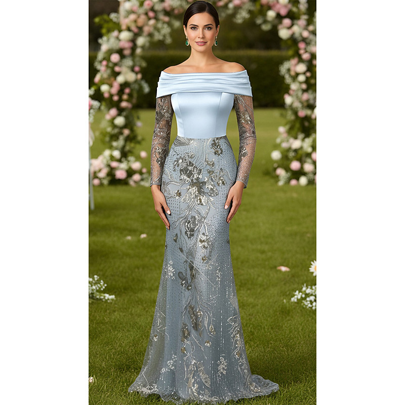 Mermaid Trumpet Sweep Brush Train Beaded Eembroidered Formal Dresses Mother of the Bride Dress Prom Dresses Evening Gown Ball Gown Formal Dress Elegant Celebrity Style Sparkle Long Sleeve Off Shoulder