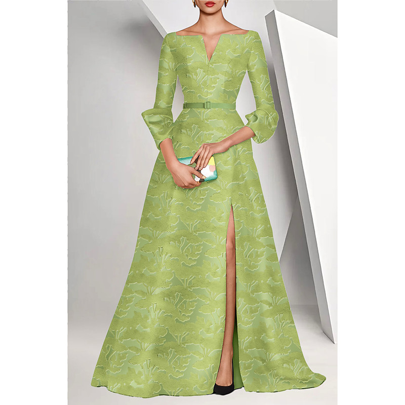 A-Line Floor Length Evening Gown Ball Gown Formal Dress Elegant High Split Silky Long Sleeve V Neck Wedding Formal Pocket Satin Jacquard with Pocket