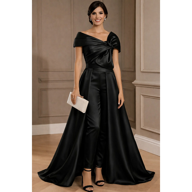 A-Line Floor Length Jumpsuit Evening Gown Ball Gown Ball Gown with Overskirt Formal Dress Elegant Silky Short Sleeve One Shoulder Wedding Formal Stretch Satin Cowl Back with Embroidered Flower Bow(s)