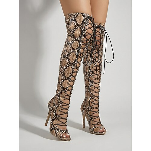 stivali alti fino alla coscia con lacci e stampa serpente da donna - tacchi a spillo per le feste notturne