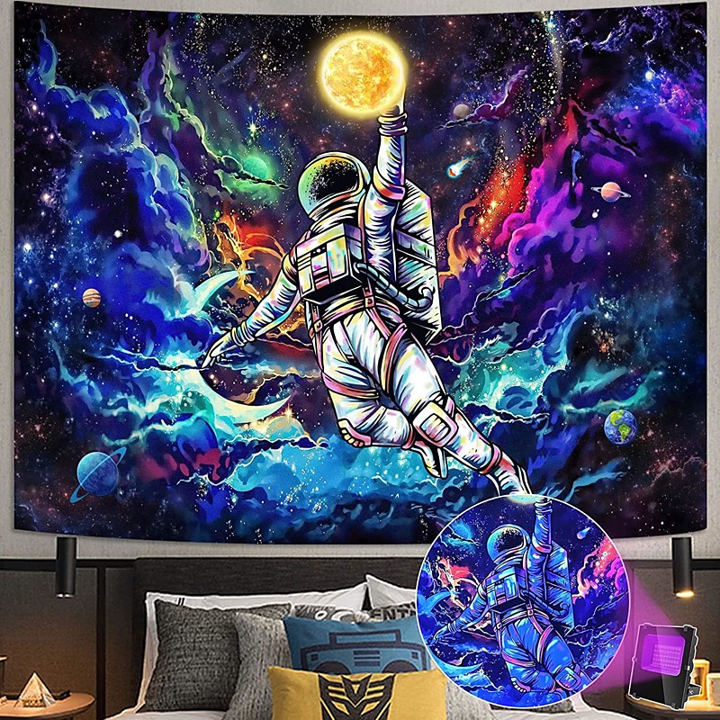 Astronaut Blacklight UV Reactive Wall Tapestry Moon Basketball Art Decor Blanket Curtain Picnic Tablecloth Hanging Home Bedroom Living Room Dorm Decoration Gift Polyester