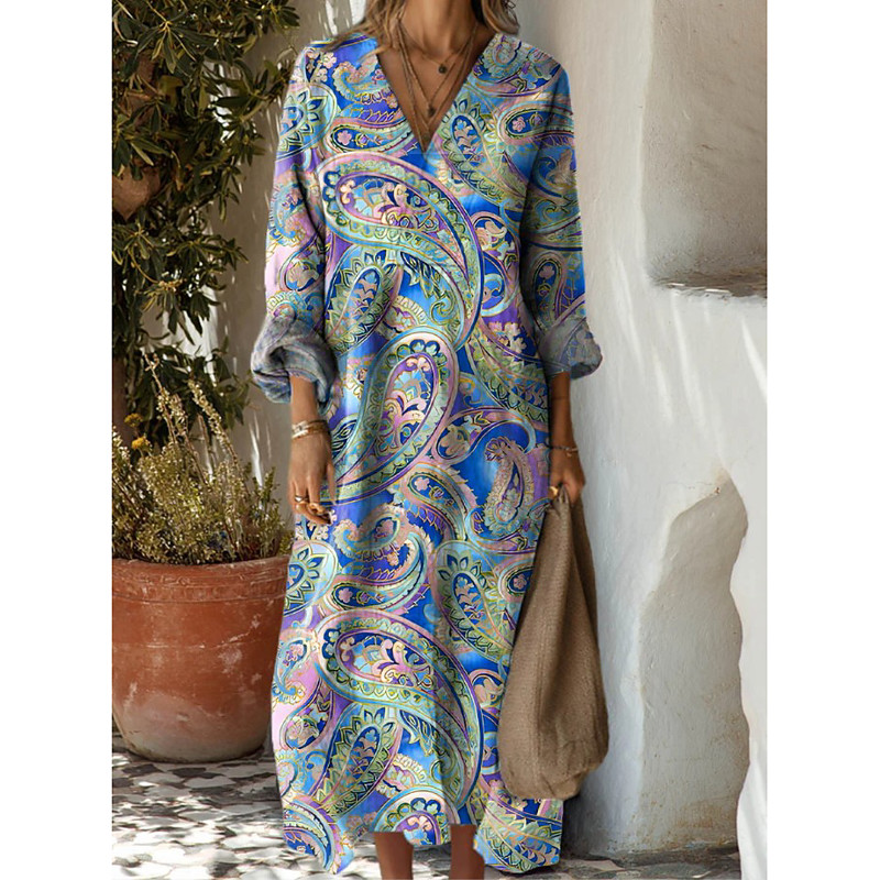 Women's Midi Dress Sundress A Line Dress Vacation Casual Boho Party Holiday Beach Loose Fit Floral Graphic Geometric Long Sleeve V Neck Black Blue Orange Green Summer Spring Fall