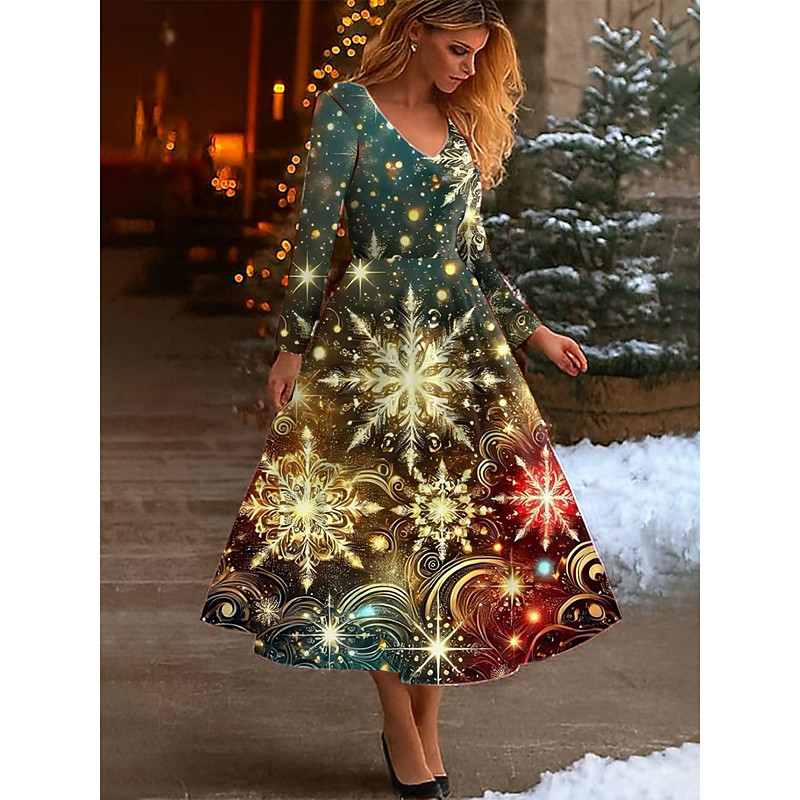 Christmas Women's Snowflake Midi Dress A Line Dress Vacation Casual Party Holiday Regular Fit Graphic Long Sleeve V Neck Black Red Purple Green Spring Fall Winter