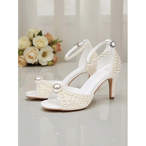 sandali da sposa con tacco alto decorati con perle e cinturino alla caviglia, eleganti scarpe da sposa aperte per la sposa, tacchi di lusso decorati con perle per la cerimonia ricezione