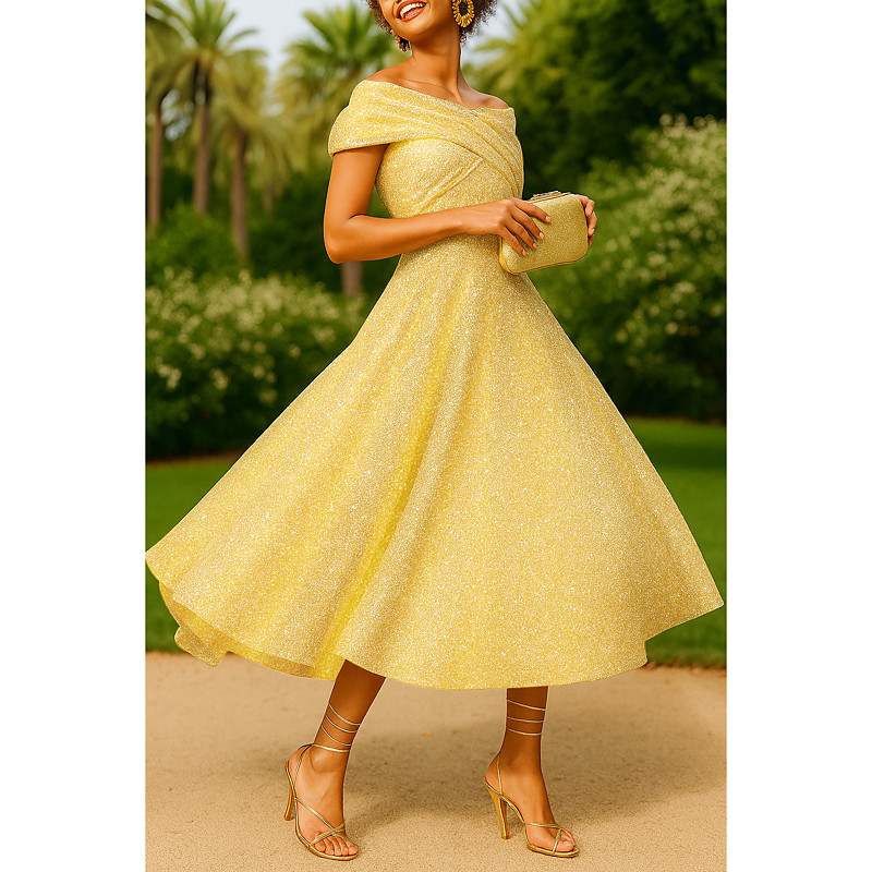 A-Line Tea Length Cocktail Dresses Party Dresses Elegant Sparkle Sleeveless Off Shoulder Garden Party Wedding Satin with Pleats