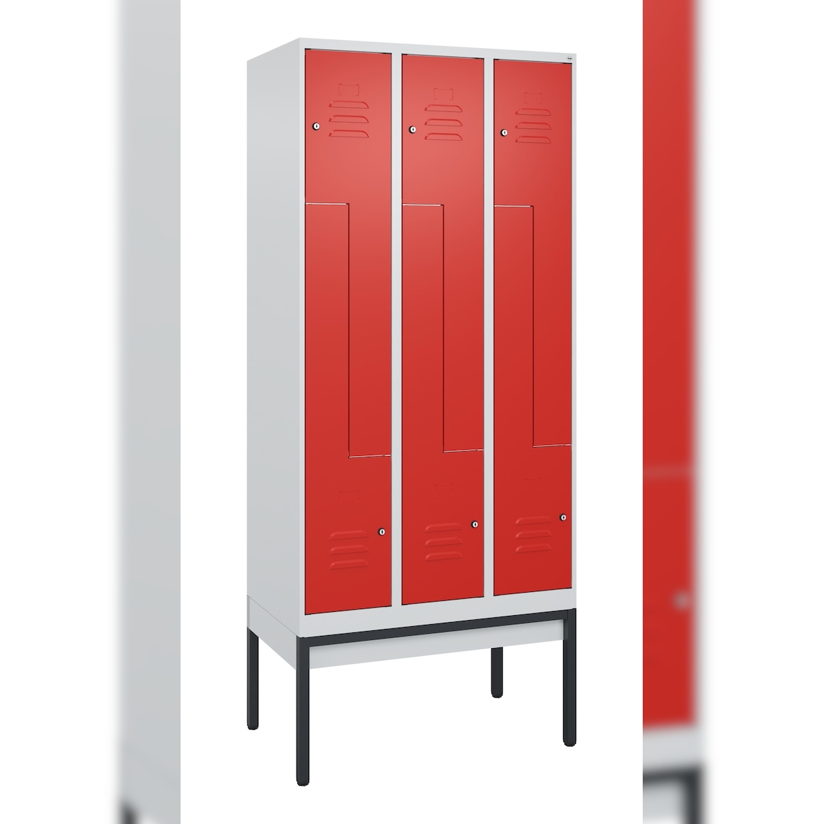 C+P Spind Classic PLUS, Füßen, 3 Abteile, HxBxT 195x90x50cm, Sicherheitsdrehriegel, Hellgrau/Rubinrot von PROREGAL