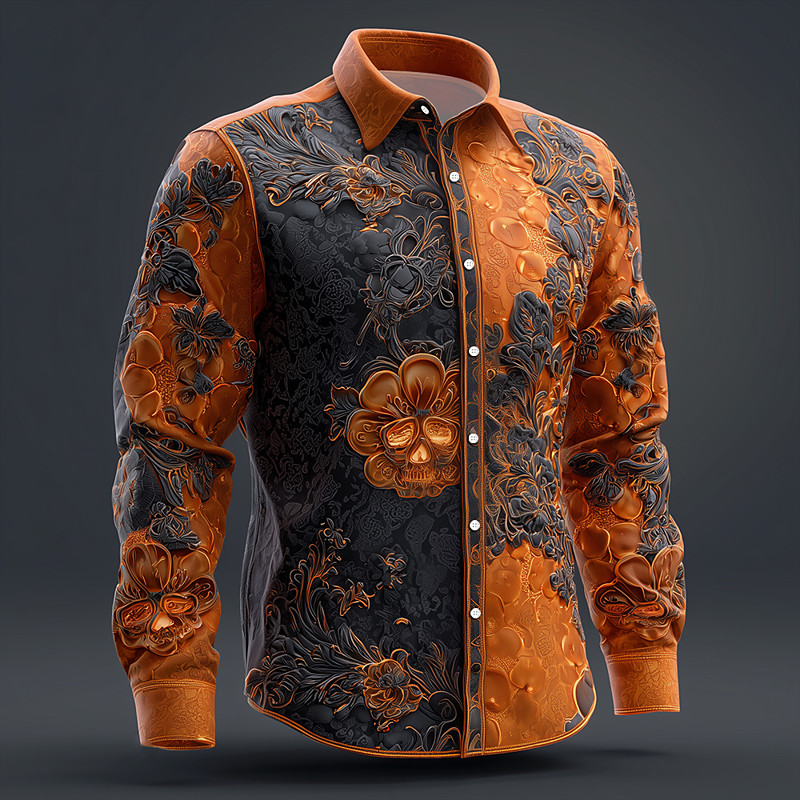 Men's Floral Print Gothic Day of the Dead Shirt Button Up Shirt Long Sleeve Vintage Retro Outdoor Holiday Spring Fall Turndown 3D Print Linen Like Shirt Orange