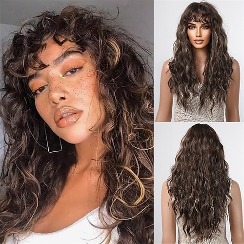 lange braune lockige Perücken für Frauen, tief gewellte Perücken mit Pony, synthetische, hitzebeständige Perücken mit Strähnchen