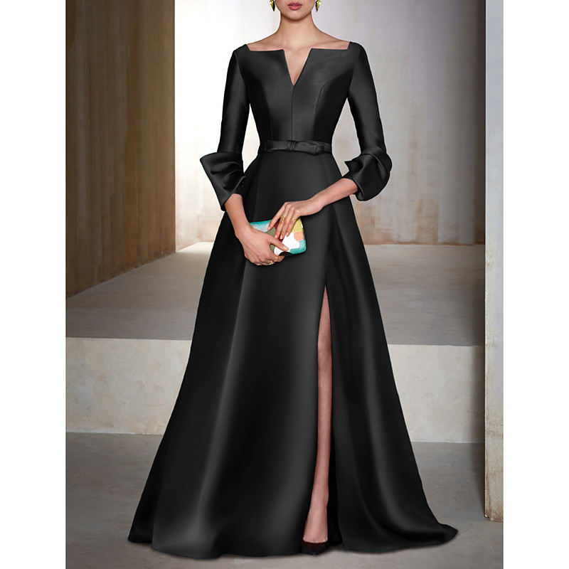 A-Line Floor Length Evening Gown Ball Gown Formal Dress Elegant Silky 3/4 Length Sleeve V Neck Wedding Guest Cocktail Party Satin with Slit