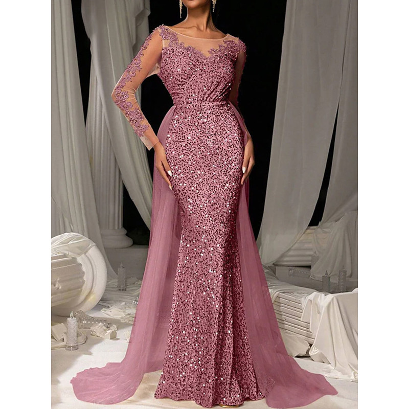 Mermaid Trumpet Floor Length Evening Gown Ball Gown with Overskirt Formal Dress Elegant Long Sleeve Crew Neck Prom Evening Party Tulle with Sequin
