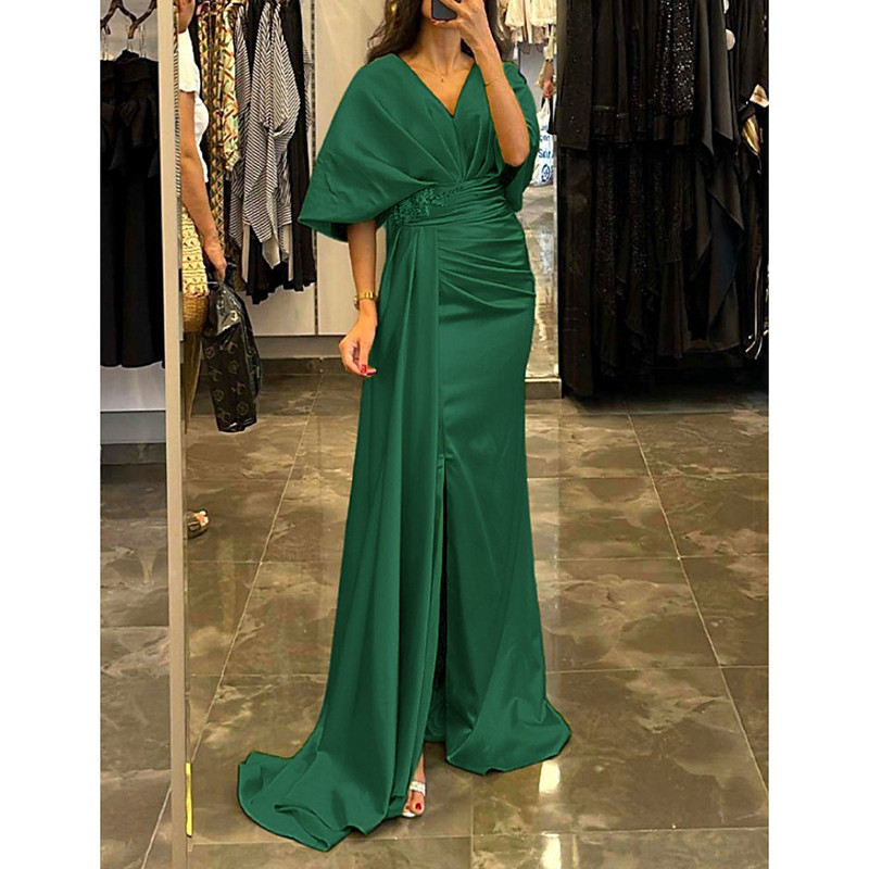 Sheath Column Sweep Brush Train Evening Gown Ball Gown with Overskirt Formal Dress Elegant Half Sleeve V Neck Formal Satin with Pleats Ruched Crystals