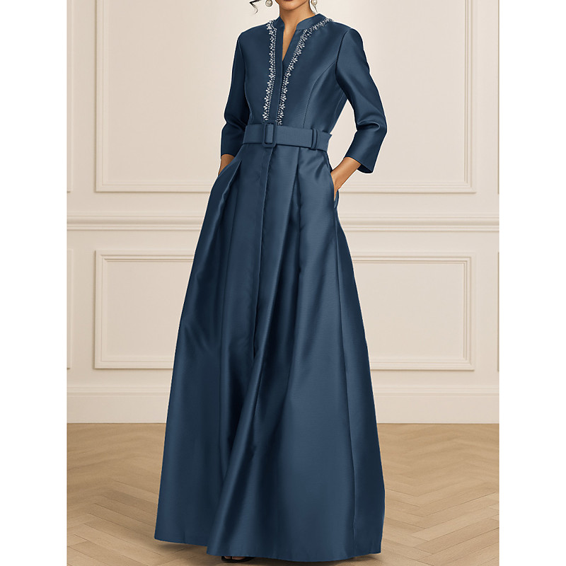 A-Line Floor Length Beaded Eembroidered Formal Dresses Mother of the Bride Dress Evening Gown Ball Gown Formal Dress Elegant Silky 3/4 Length Sleeve Crew Neck Wedding Formal Pocket Satin Stretch Satin