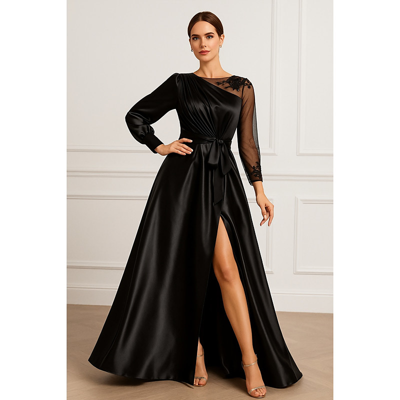 A-Line Floor Length Evening Gown Ball Gown Formal Dress Elegant High Split Long Sleeve Illusion Neck Wedding Formal Pocket Satin with Ruched