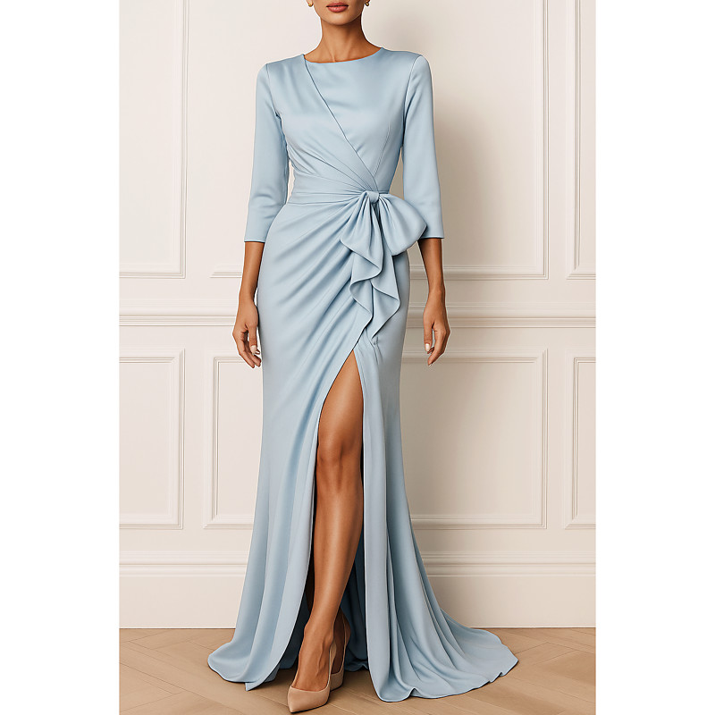 A-Line Floor Length Prom Dresses Evening Gown Ball Gown Elegant High Split 3/4 Length Sleeve Crew Neck Wedding Formal Satin with Bow(s) Pleats Ruffles