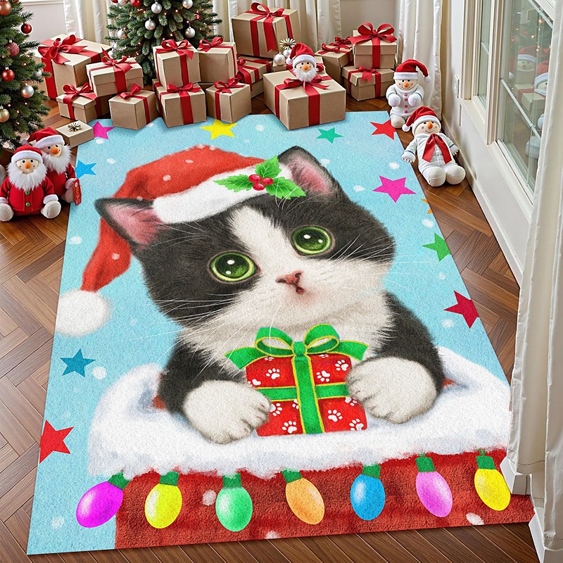 Christmas Gift Cat Area Rug For Living Room And Bedroom, Faux Cashmere Present Carpet Cute Holiday Art Rug Soft Non-Slip Machine Washable Rug, 5x7 ft, TuxedoCatInChimney by Kayomi Harai