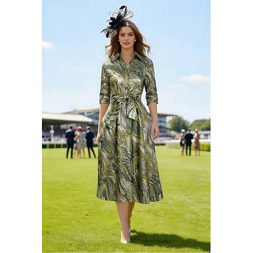 Linea ad A Lunghezza Tè Abito da invitata a nozze Abito Formale Abito da sera Abito da cerimonia per signora Manica 3/4 Bavero Elegante Vintage Petite Formale Jacquard con Stampa floreale Fascia