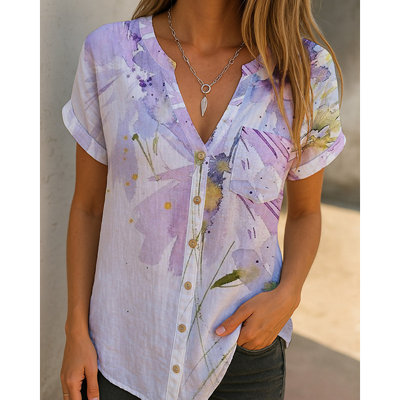 Women's Shirt Blouse Flower Modern Casual Short Sleeve V Neck Regular Tops Daily Holiday Buttons Print Grass Green Blue Purple Green Fall