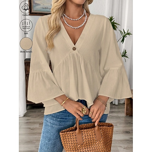 Per donna Blusa Tinta unica Elegante Casual Manica 3/4 Scollo a V Top Regolari Quotidiano Arricciato Nero Bianco Blu marino Albicocca Estate Primavera