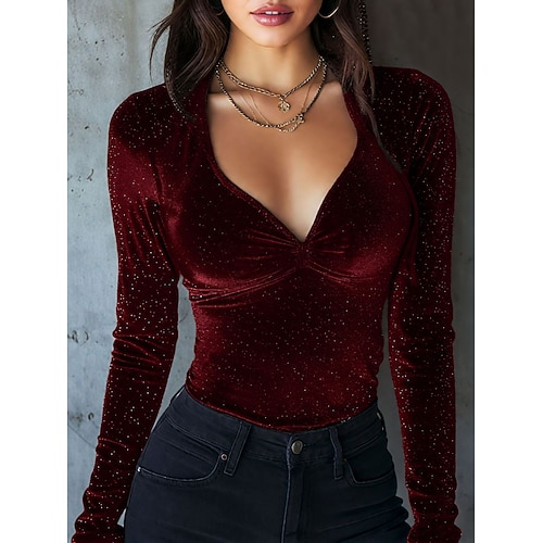 Per donna Blusa Tinta unica Elegante Casual Manica Lunga Scollo a V Top Regolari Quotidiano Arricciato Nero Vino Blu Reale Viola Verde Primavera Autunno