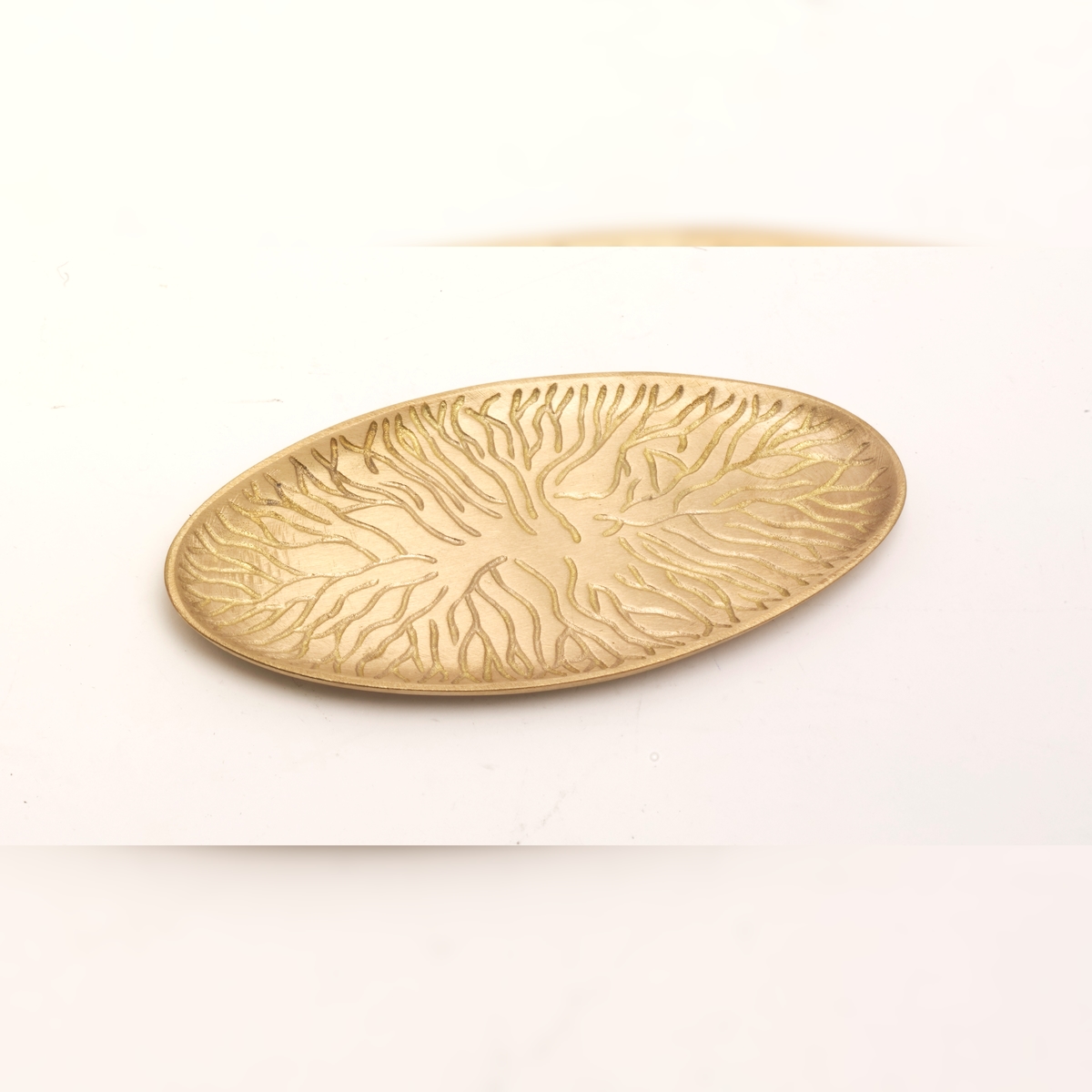 Kerzenteller, Dekoteller in ovaler Form Messing Gold matt im Baum-Design 18 x 9 cm Ellipsenkerzen