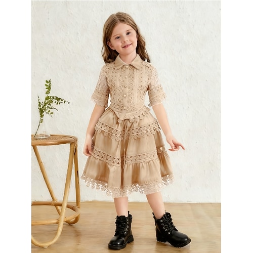 2 Pezzi Bambini Ragazze Tinta unica Pizzo Abiti eleganti Impostato Manica Corta Moda All'aperto Dai 4 anni in su Estate Blu Bianco Rosa