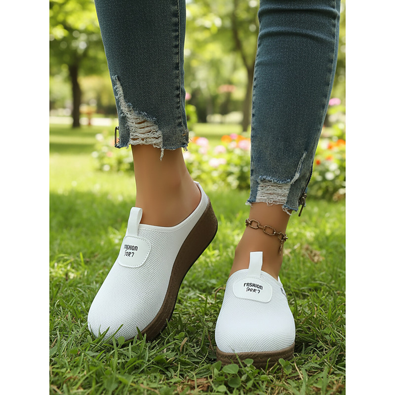 Women's White Breathable Mesh Slip-On Mules - Sporty Athleisure Shoes with Wedge Sole for Daily Errands, Travel and Active Lifestyles