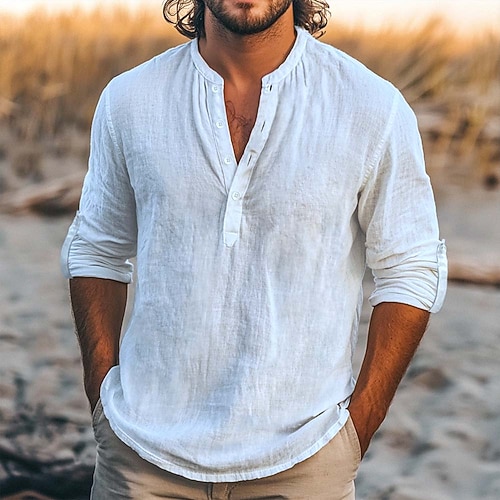 Per uomo Camicia Camicia di lino Camicia Estiva Camicia da Spiaggia Tinta unica Vacanza Casuale Nero Bianco Azzurro Manica Lunga Henley Abbigliamento Tasche Multiple