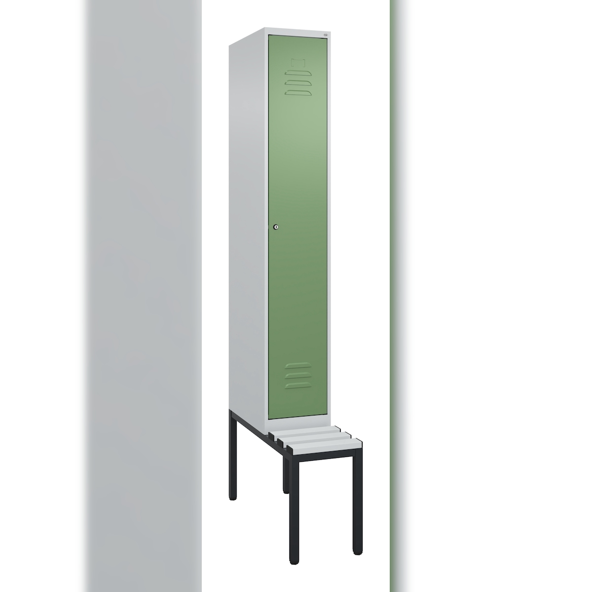 C+P Spind Classic PLUS, Kunststoff untergebaute Sitzbank, 1 Abteil, HxBxT 212x30x82cm, Zylinderschloss, Hellgrau/Resedagrün von PROREGAL