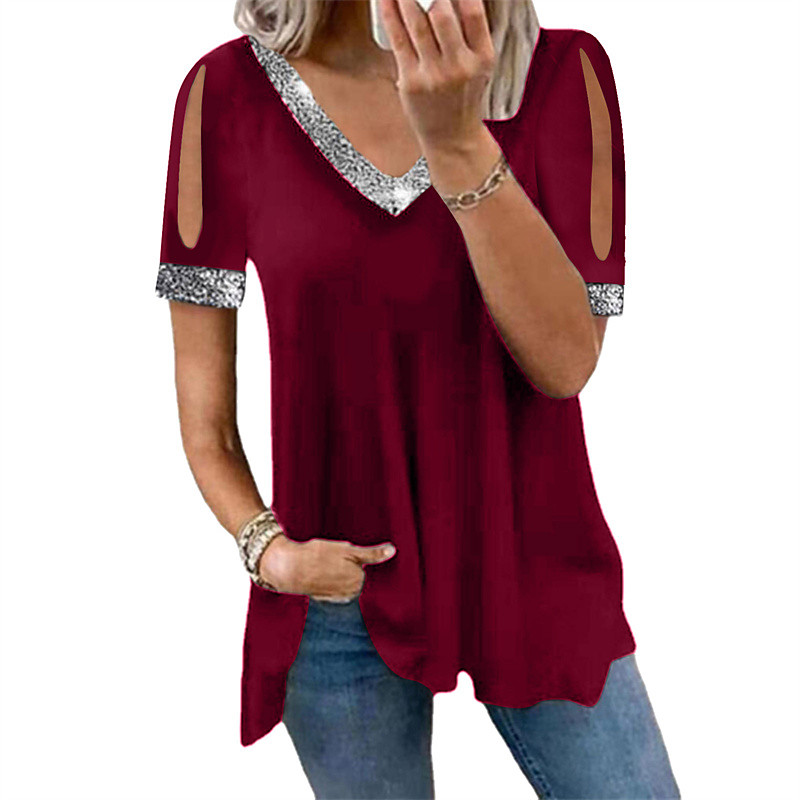 Women's Blouse Dressy Tops Plain Elegant Vintage Daily Short Sleeve V Neck Regular Tops Daily Work Holiday Ruched Sequins Patchwork Black Pink Wine Purple Dark Gray Summer Spring