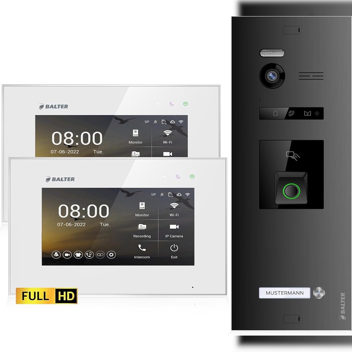 HD Video Türsprechanlage mit Fingerprint und RFID für 1 Familienhaus, 2x Monitore, Balter EVO HD Fingerprint