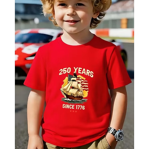 100% Cotone Bambini Ragazzi Nero Bianco Rosso Nave Bandiera USA 250° anniversario Maglietta Blusa Girocollo Manica Corta All'aperto Abbigliamento Quotidiano Moda Streetwear Designer Stampa Estate
