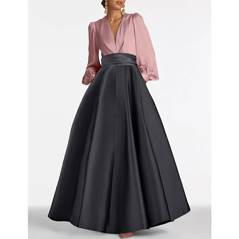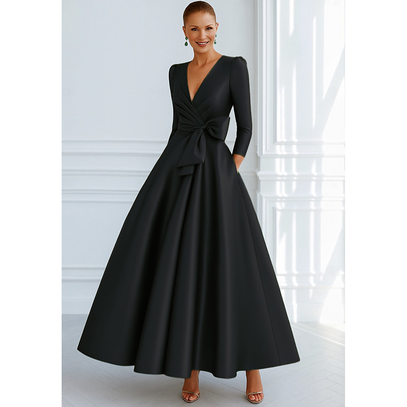 A-Line Floor Length Evening Gown Ball Gown Formal Dress Elegant Silky 3/4 Length Sleeve V Neck Wedding Formal Pocket Stretch Satin with Bow(s)
