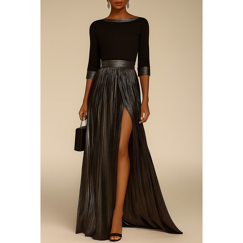 A-Line Floor Length Prom Dresses Evening Gown Ball Gown Formal Dress Elegant Color Block Silky Long Sleeve Boat Neck Wedding Formal Champagne Mother Of the Bride Dress Stretch Satin with Pleats
