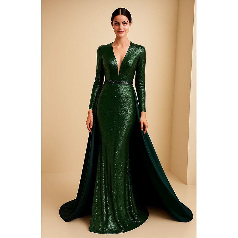 Mermaid Trumpet Sweep Brush Train Evening Gown Ball Gown with Overskirt Formal Dress Elegant Silky Long Sleeve V Neck Wedding Formal Capes Sequined with Beading