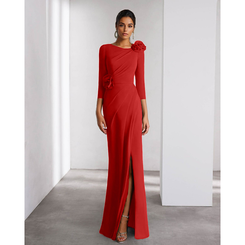 A-Line Floor Length Prom Dresses Evening Gown Ball Gown Formal Dress Elegant Vintage High Split Long Sleeve Crew Neck Wedding Formal Detachable Stretch Crepe with Shouder Flower